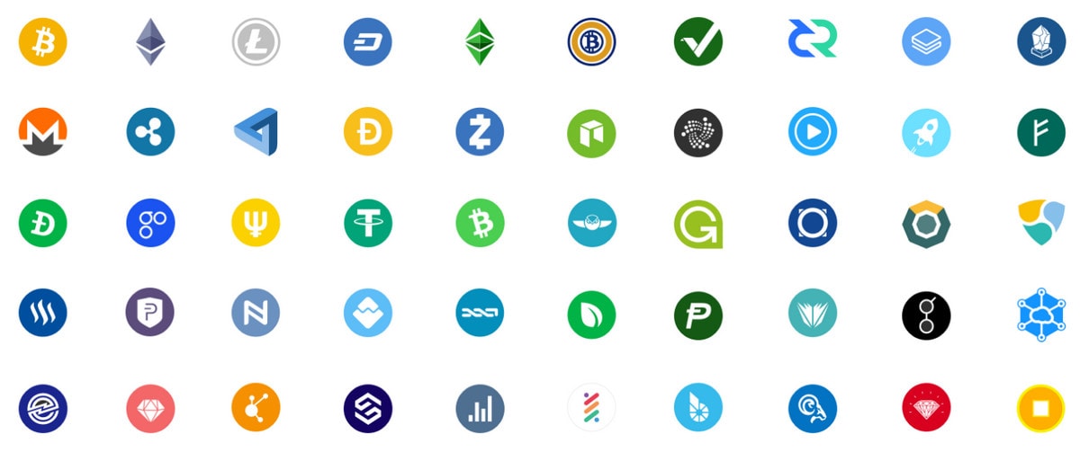 A set of crypto and fiat currency icons.